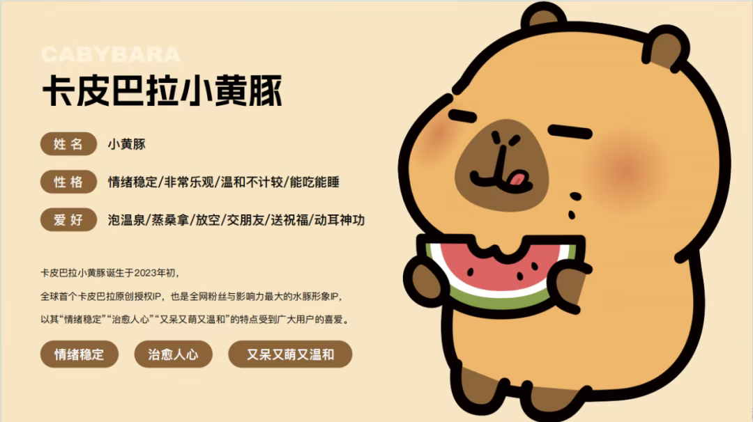 在当代社会高速运转的背景下,年轻人面临着来自职场竞争、生活压力与社交关系的多重挑战,精神内耗与情绪焦虑已成为普遍性社会议题。在此语境下,卡皮巴拉小黄豚作为全球首个原创水豚 IP,以 "情绪稳定" "治愈人心" 的形象定位,成为都市青年群体的情感寄托载体。这一 IP 凭借憨态可掬的视觉符号与松弛温和的价值内核,在社交媒体场域中构建起独特的情感共鸣机制,不仅实现全网粉丝量突破百万、线上曝光量超100亿的传播影响力,更与多领域头部品牌达成深度合作,形成兼具文化价值与商业潜力的现象级 IP 生态。