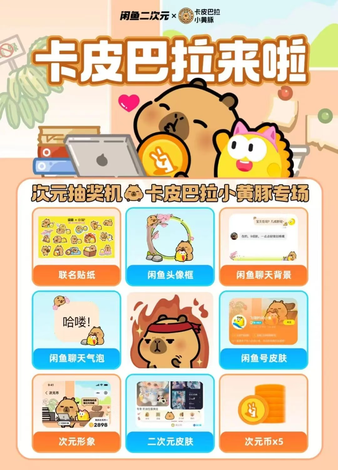 在“生活”类目中,小黄豚走进了衣食住行的各个角落。中国银行与卡皮巴拉合作推出了定制联名卡和线上活动;二手交易平台“闲鱼”也推出了小黄豚主题补贴活动和周边;虎丘婚纱城和小黄豚的联名打开了浪漫边界 。同时,领克汽车也推出了联名概念车和定制车贴,让这只萌系动物走上了公路 。这些生活类联名,以灵动的卡通造型和趣味玩法,将实用与萌趣兼容,让日常变得生动有趣。