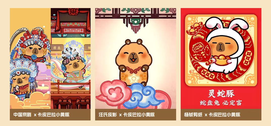 在商业价值持续爆发的同时,卡皮巴拉小黄豚以“文化传承者”身份开启传统非遗与现代IP的创新融合。品牌团队将水豚形象与敦煌壁画、汪氏皮影、杨钺剪纸等非遗元素解构重组:敦煌联名中,小黄豚化身披飞天飘带的“治愈使者”,通过动态表情包让九色鹿纹样以萌趣姿态进入年轻人社交场景;汪氏皮影创作《豚豚贺岁》系列短片,会动耳的小黄豚演绎“蛇盘兔”谚语,短片在B站大受好评,超60%弹幕感叹“皮影可以这么萌”。